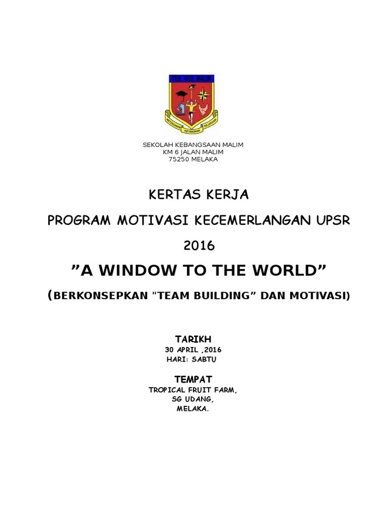 Sekolah menengah sains kepala batas 13200 kepala batas, pulau pinang kertas cadangan sambutan maulidur rasul 1434h/ 2013m diusulkan untuk pengetua sekolah . Kertas kerja program motivasi kecemerlangan upsr 2016. Contoh kertas kerja berikut adalah penting sebagai rujukan anda yang. A window to the world. View contoh template muka depan tugasan pelajardocx from imc 402 at.